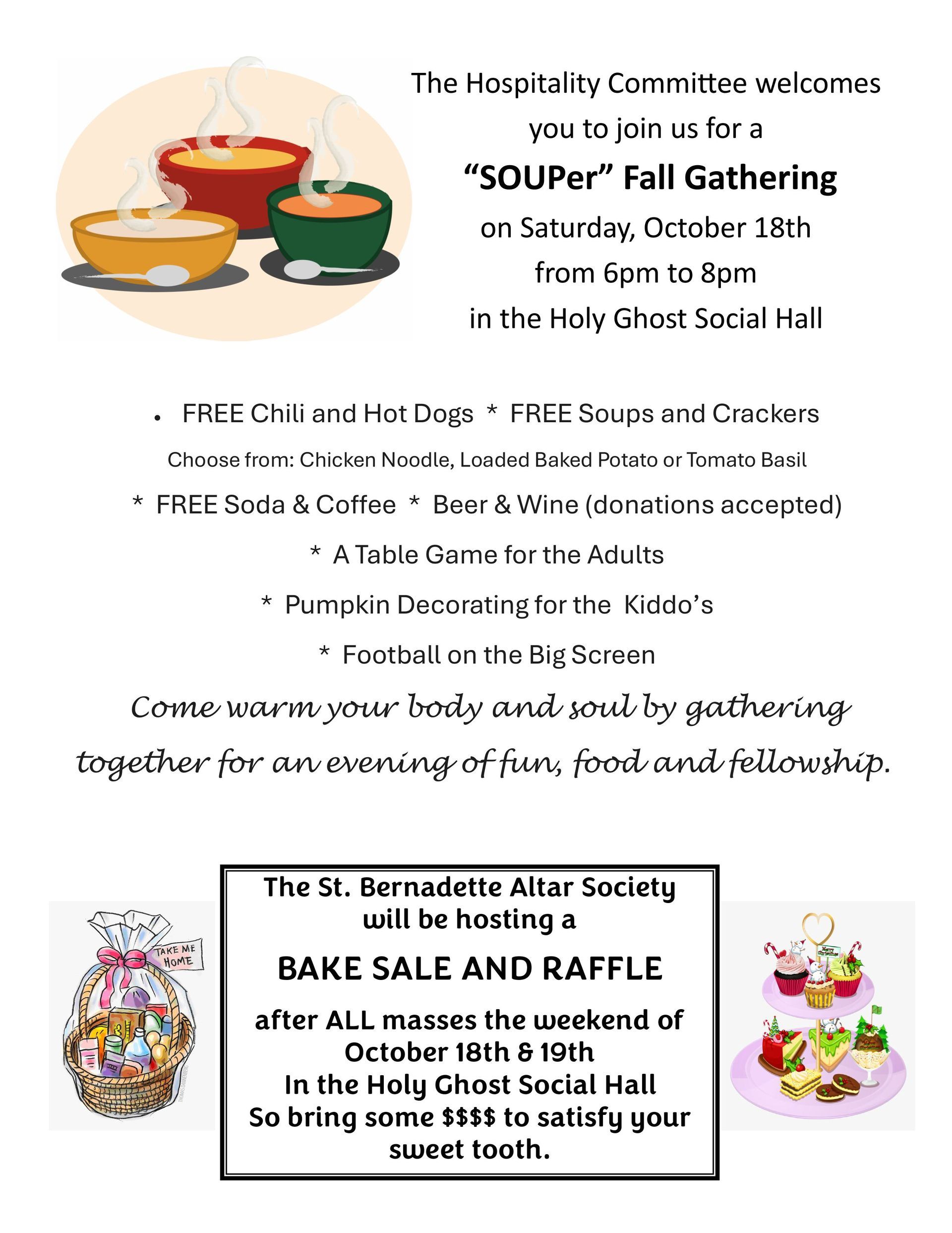 The Hospitality Committee invites you to join us for a “SOUPer” Fall Gathering on Saturday, October 18, from 6 to 8 p.m. in the Holy Ghost Parish Social Hall.
